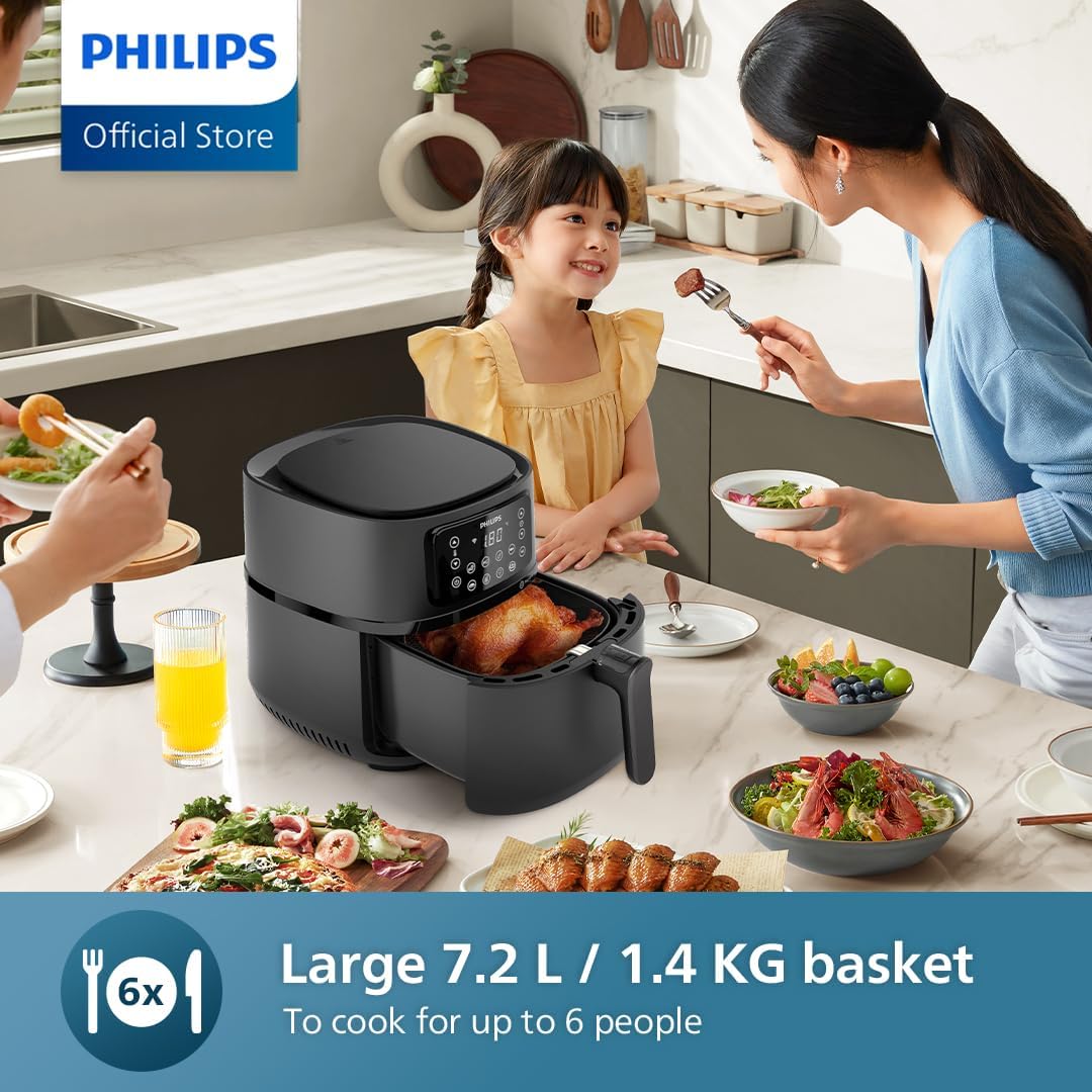 - XXL CAPACITY: With a 7.2L pan and 1.4kg basket, cook everything from chips and chicken drumsticks to cakes and grilled veggies – 7 preset cooking programs with touchscreen display. Make up to 6 meal portions in one go for your family and friends.